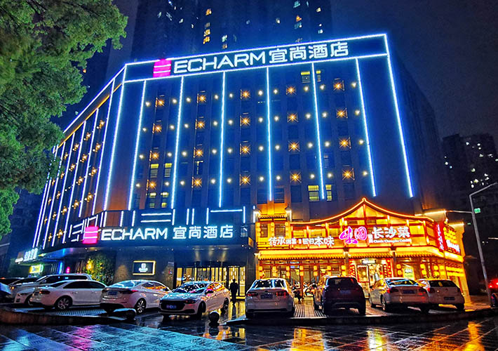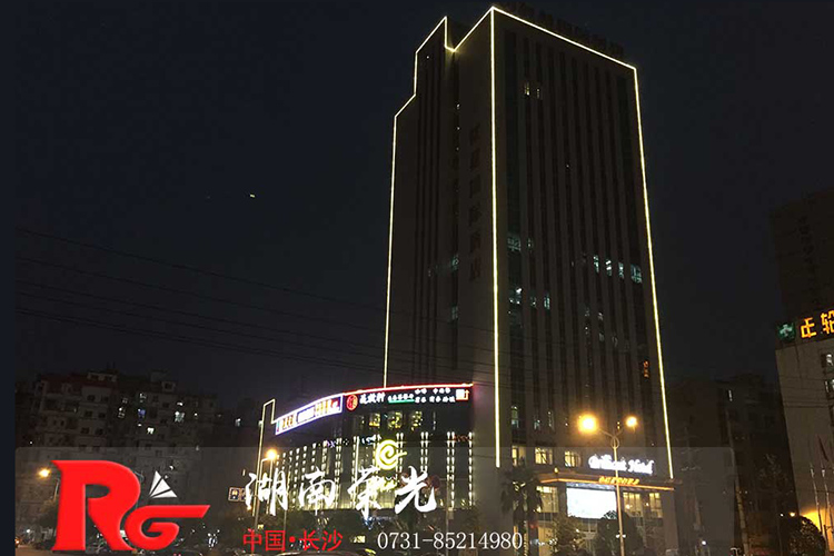 長沙酒店亮化 戶外亮化設計 LED夜景亮化安裝及施工工程采用IP 65防護等級的LED線條燈,十字星光燈搭配設計。燈具色溫采用冷、暖色搭配設計,主線條燈勾勒出建筑亮化的輪廓,采用暖色星光燈營造長沙酒店亮化的溫馨氛圍。
